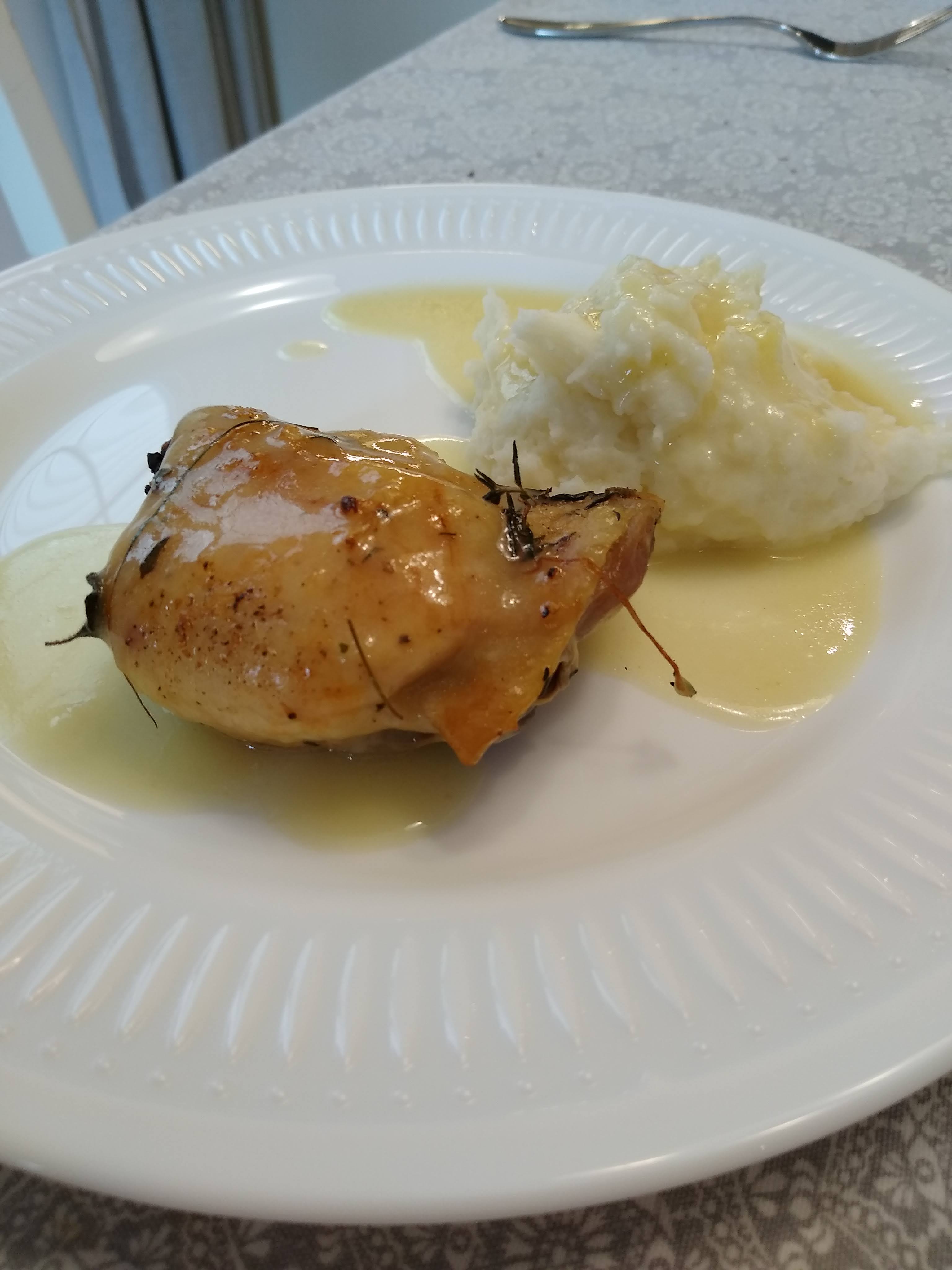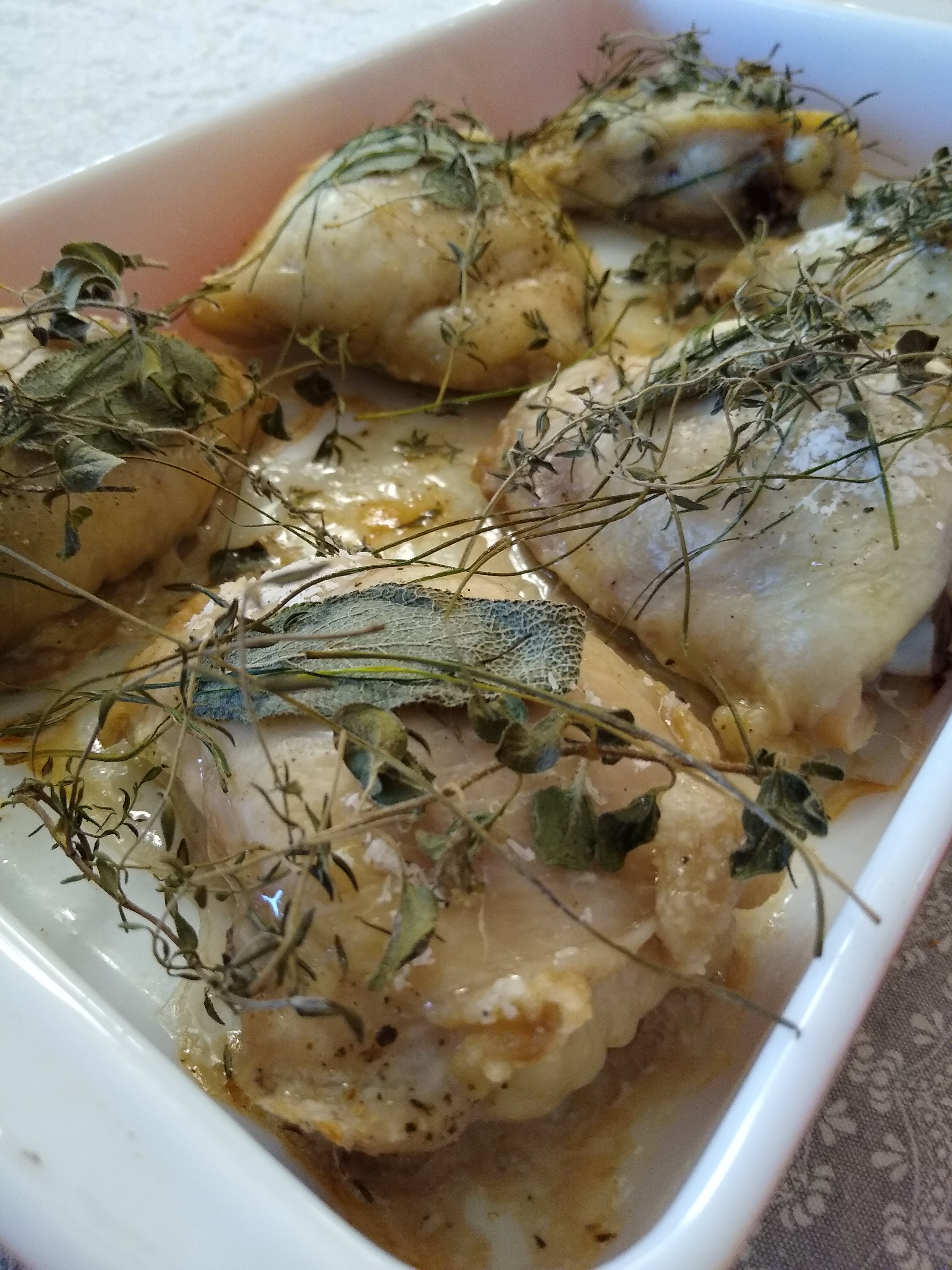 Here is the chicken fully cooked with crispy skin. I picked off most of the big pieces of herbs, but if you used regular dried herbs, you can skip that step. I probably baked this for 45 minutes, but you can use a meat thermometer if you’re nervous.