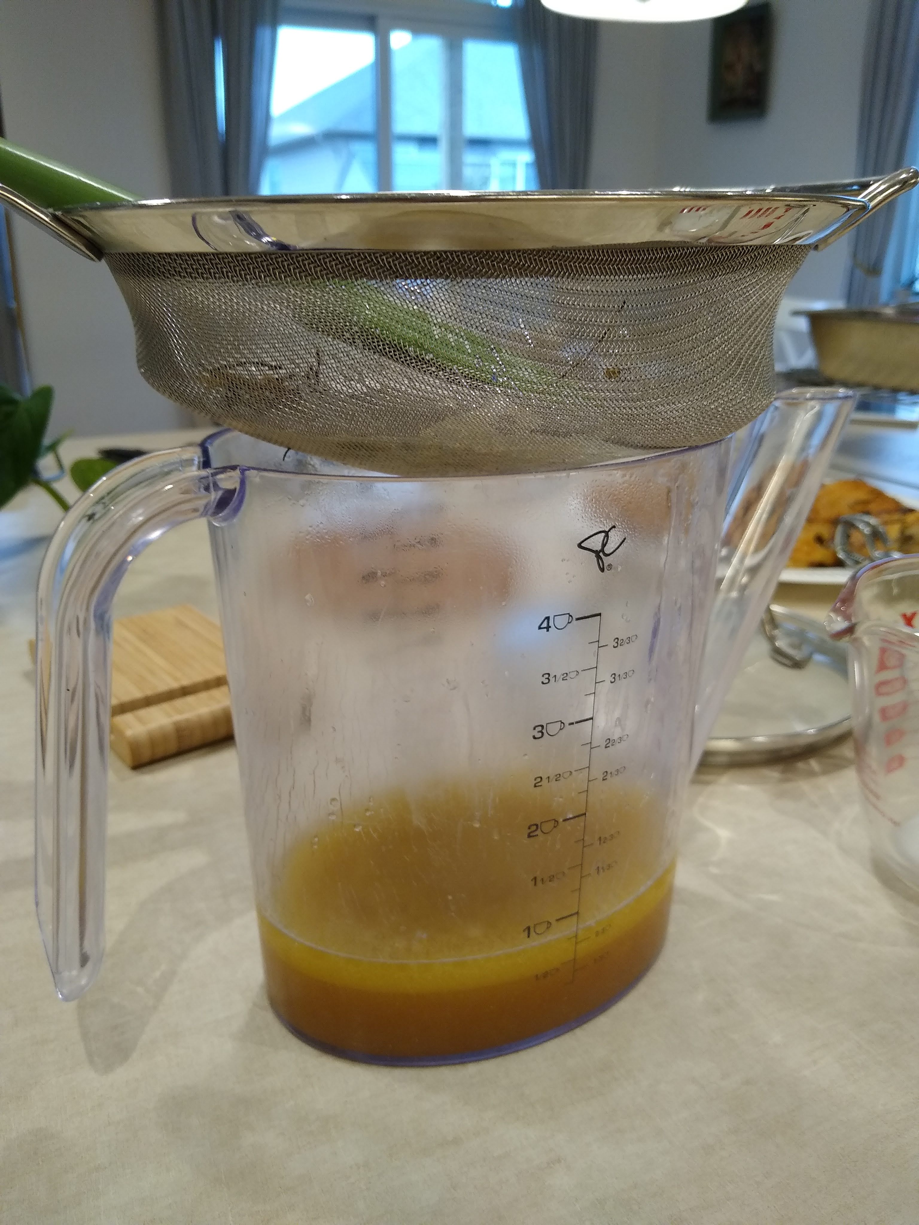 Here it is quite clear that the darker liquid on the bottom is the tasty broth you baked with and you will pour that off into the glass cup with your other broth made from chicken bullion.