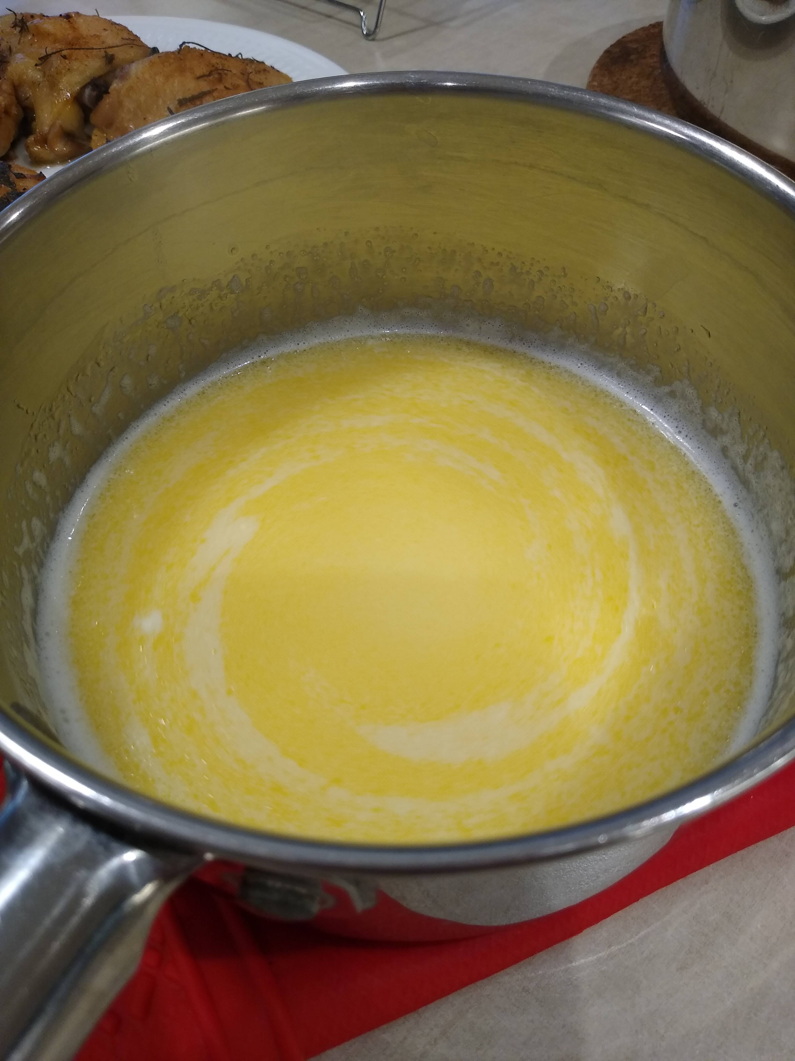Then I warm up in a small pan some milk and butter. I don’t measure so these are approximate amounts: 1/2 cup of milk and two big spoonfuls of butter. I let that simmer on low heat for a minute or two until the butter is melting into the milk.