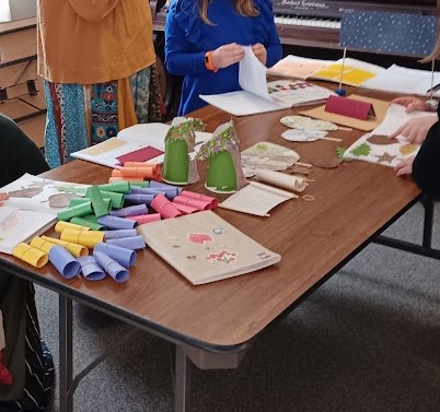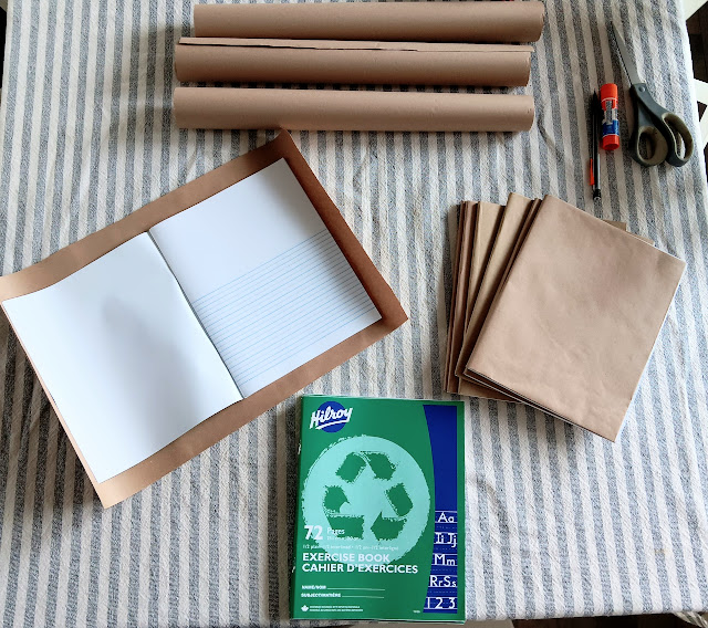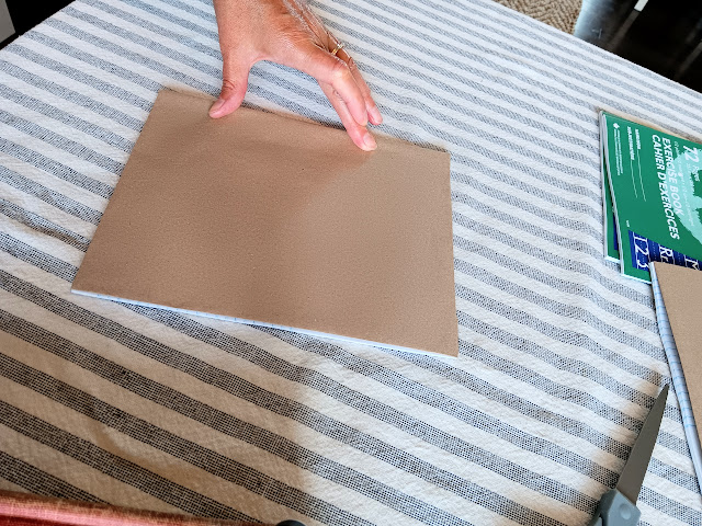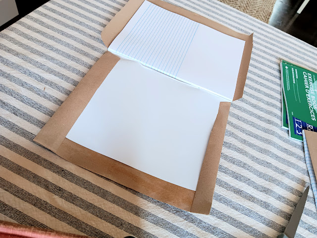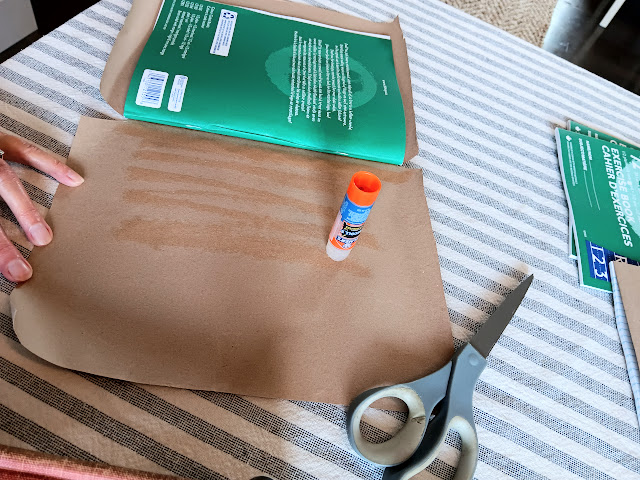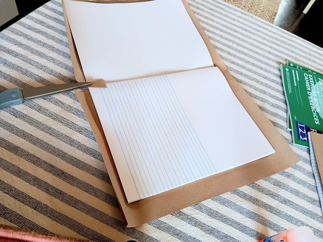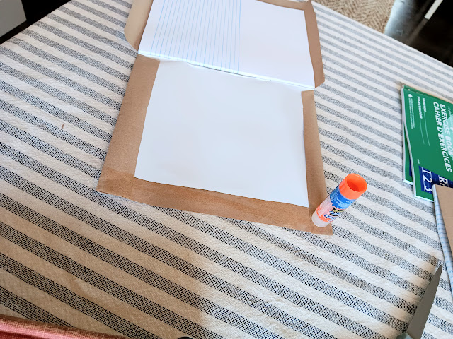 I made up these individual notebooks for them to decorate and use for the entire year of lessons. I have done this before for various other class projects in our former churches and for other purposes. I used basic kraft paper found everywhere and a regular glue stick. Once you cut the paper for a generous folding around the edges, the only trick is to cut the small triangular cuts at the top and bottom of the binding so you can easily fold the paper and glue it inside the front and back covers. Then you can glue the corners down to create a squared off finish. Running your hands smoothly across the cover helps pull the kraft paper tightly as you close the book up to let it dry. It really is very easy and probably reminiscent of covering school books with paper grocery bags for the year if you’re of a certain vintage like me. Yikes!