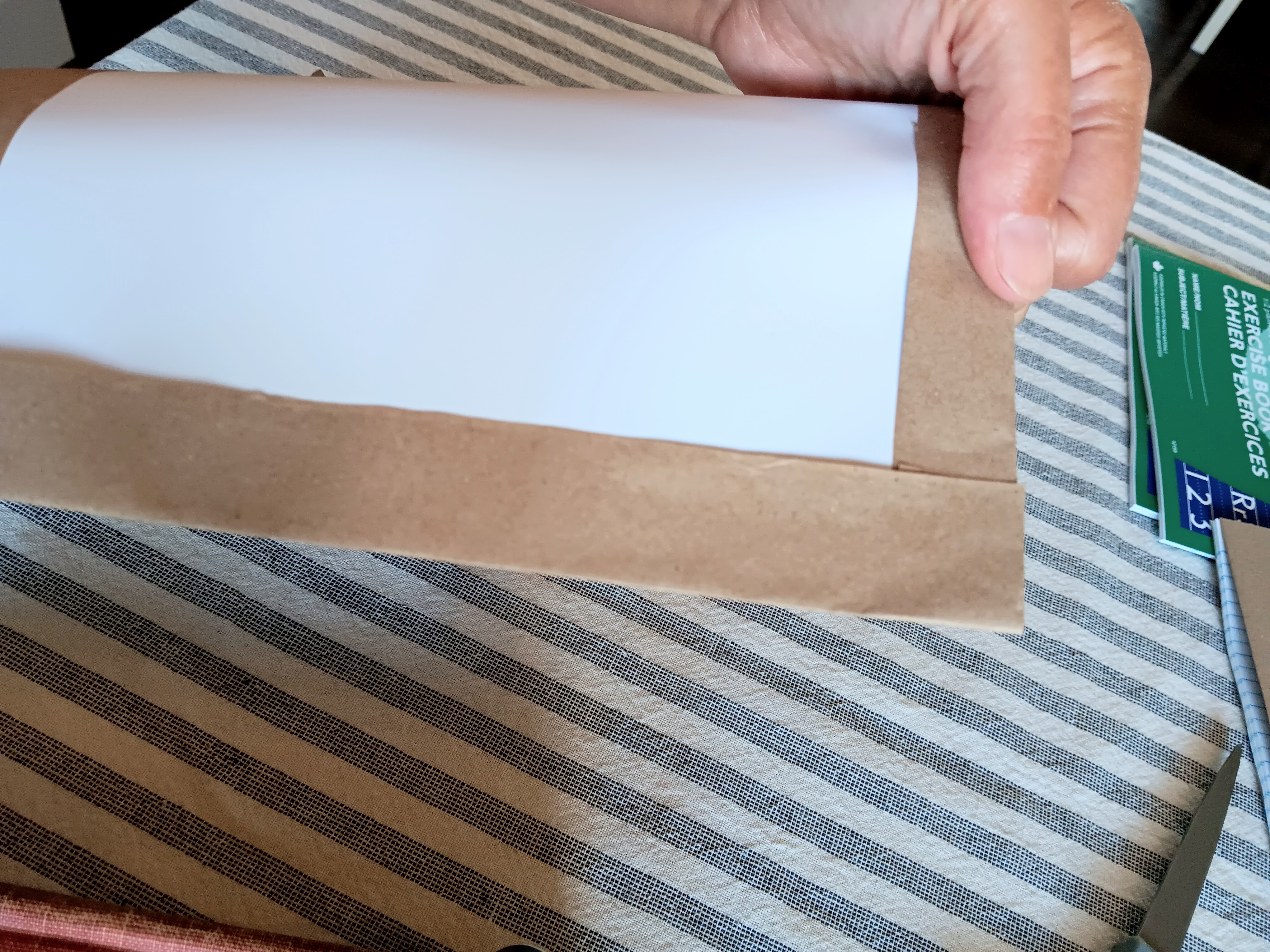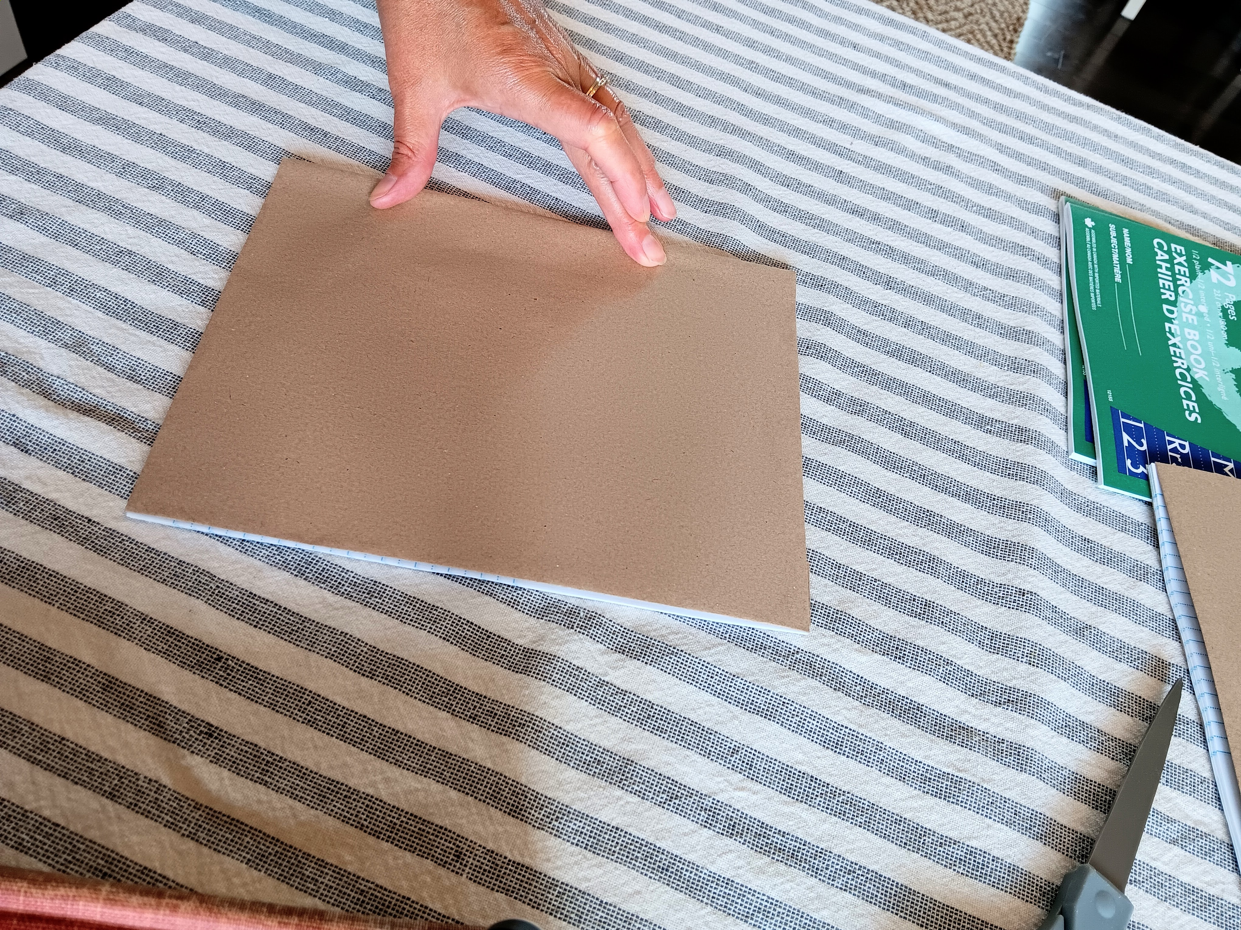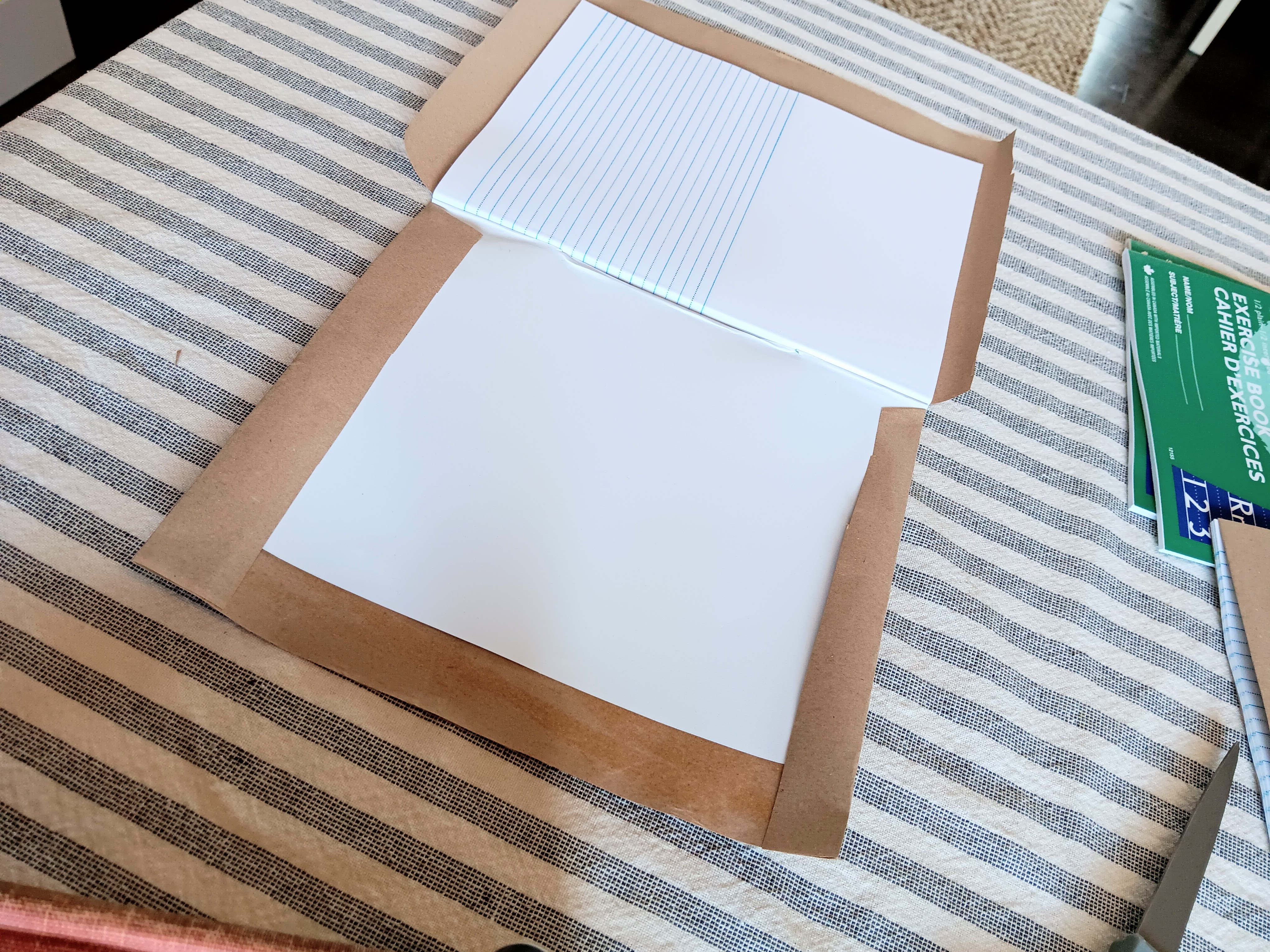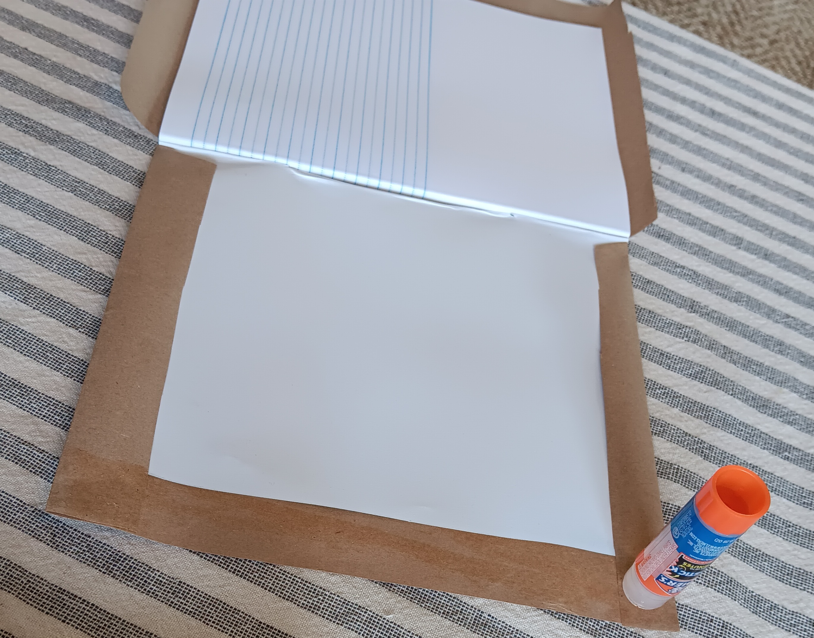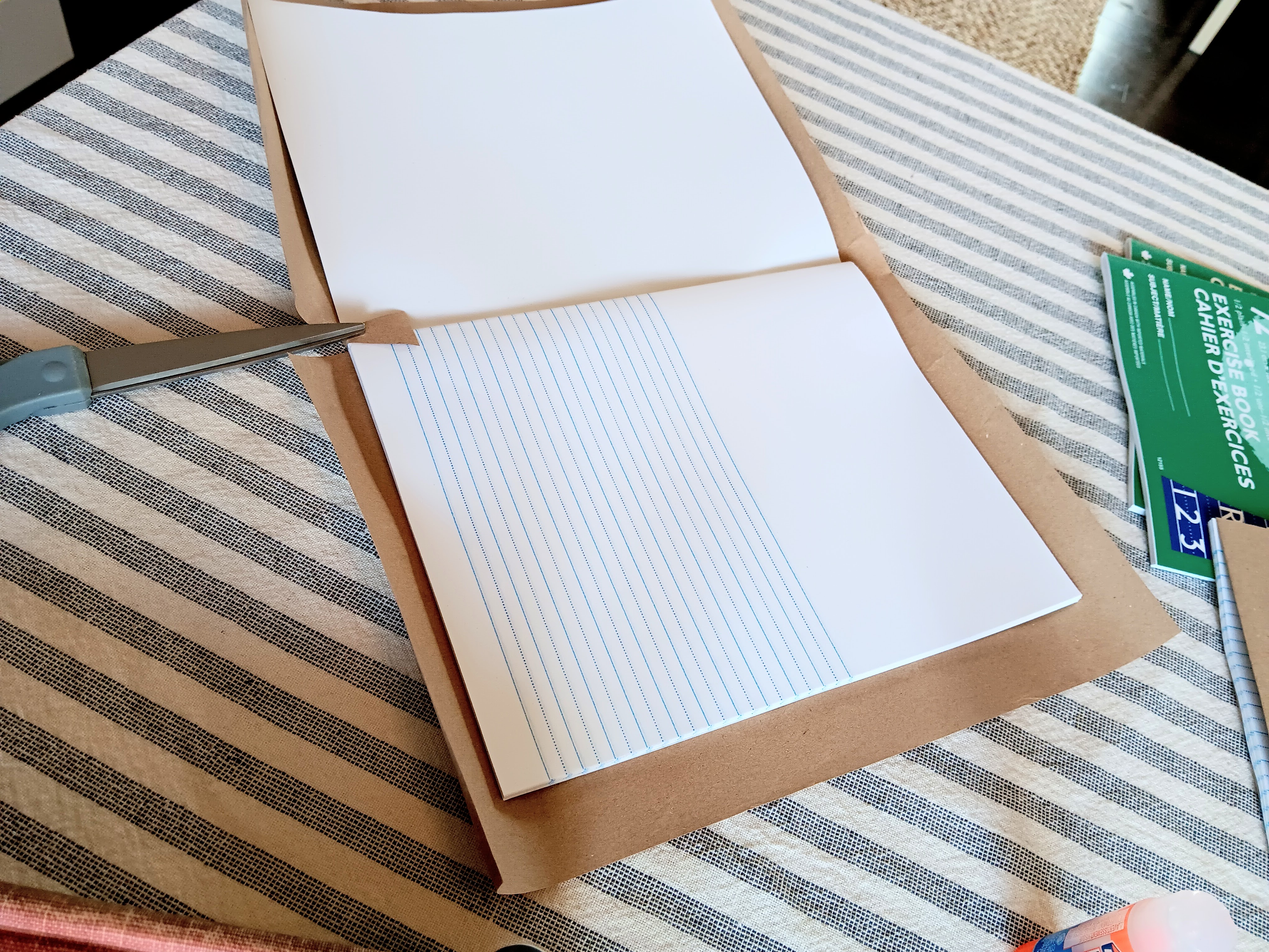 I made up these individual notebooks for them to decorate and use for the entire year of lessons. I have done this before for various other class projects in our former churches and for other purposes. I used basic kraft paper found everywhere and a regular glue stick. Once you cut the paper for a generous folding around the edges, the only trick is to cut the small triangular cuts at the top and bottom of the binding so you can easily fold the paper and glue it inside the front and back covers. Then you can glue the corners down to create a squared off finish. Running your hands smoothly across the cover helps pull the kraft paper tightly as you close the book up to let it dry. It really is very easy and probably reminiscent of covering school books with paper grocery bags for the year if you’re of a certain vintage like me. Yikes!