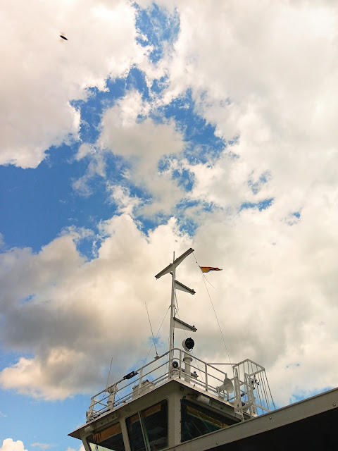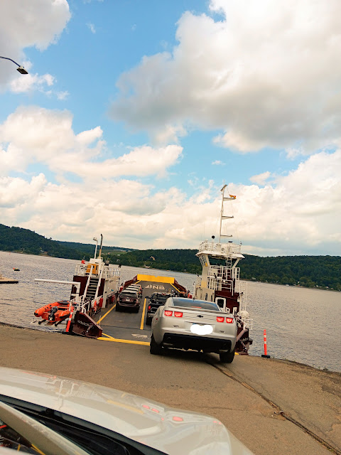 Shane and I went up alone to harvest the beleaguered garlic bed at the rural property two ferries away. The first ferry is about 6 kilometers from our house (and can be seen from our third floor loft room) and runs two ferries at a time so the wait is usually not that long for the short crossing to the peninsula. Today we were able to drive right on to the ferry on our side as the last car without any wait at all. Then it’s about a 15 minute drive to the next ferry across a wider river that only has one ferry. We waited for only about 4 minutes with a motorcycle crew and plenty of other vehicles with various greetings passing between drivers coming and going. The local farmstand and ice cream shop was busy with kayakers and locals on this summer holiday.