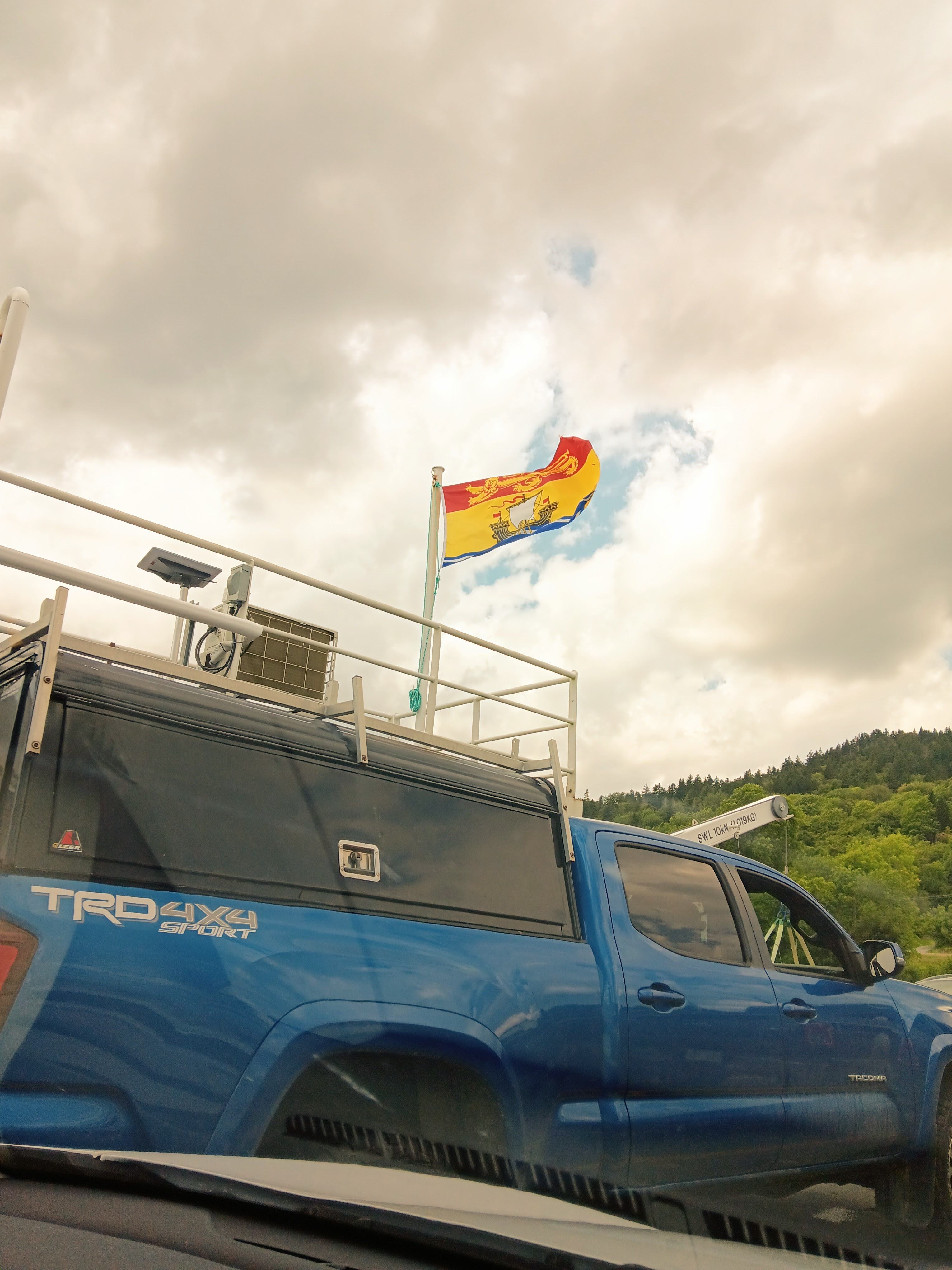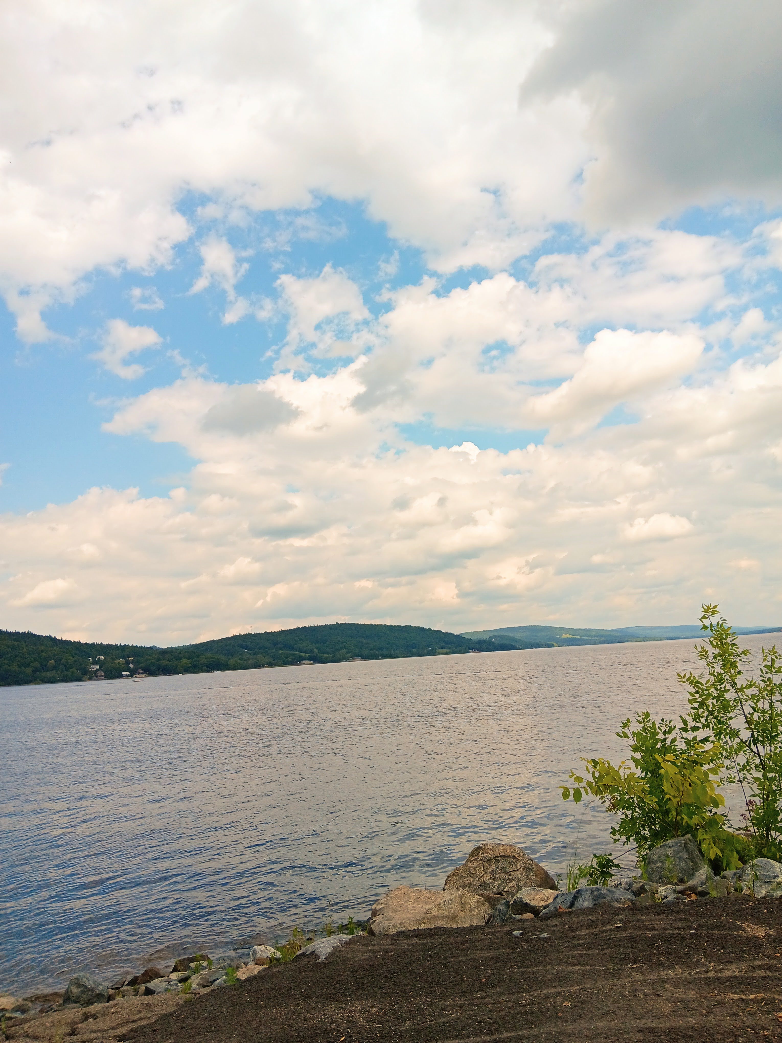 Shane and I went up alone to harvest the beleaguered garlic bed at the rural property two ferries away. The first ferry is about 6 kilometers from our house (and can be seen from our third floor loft room) and runs two ferries at a time so the wait is usually not that long for the short crossing to the peninsula. Today we were able to drive right on to the ferry on our side as the last car without any wait at all. Then it’s about a 15 minute drive to the next ferry across a wider river that only has one ferry. We waited for only about 4 minutes with a motorcycle crew and plenty of other vehicles with various greetings passing between drivers coming and going. The local farmstand and ice cream shop was busy with kayakers and locals on this summer holiday.