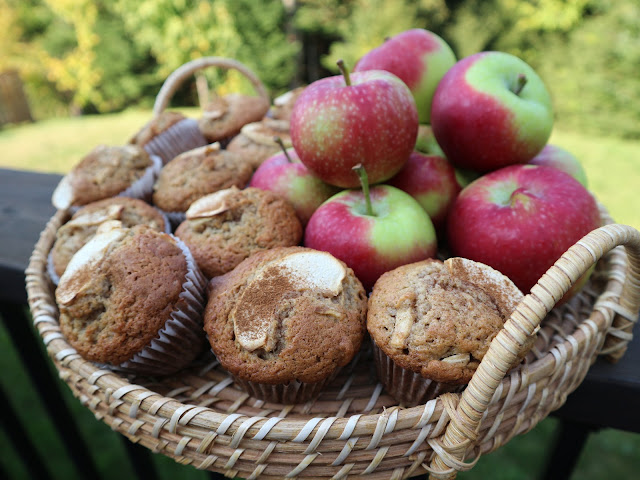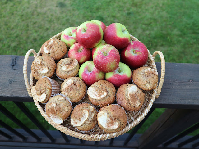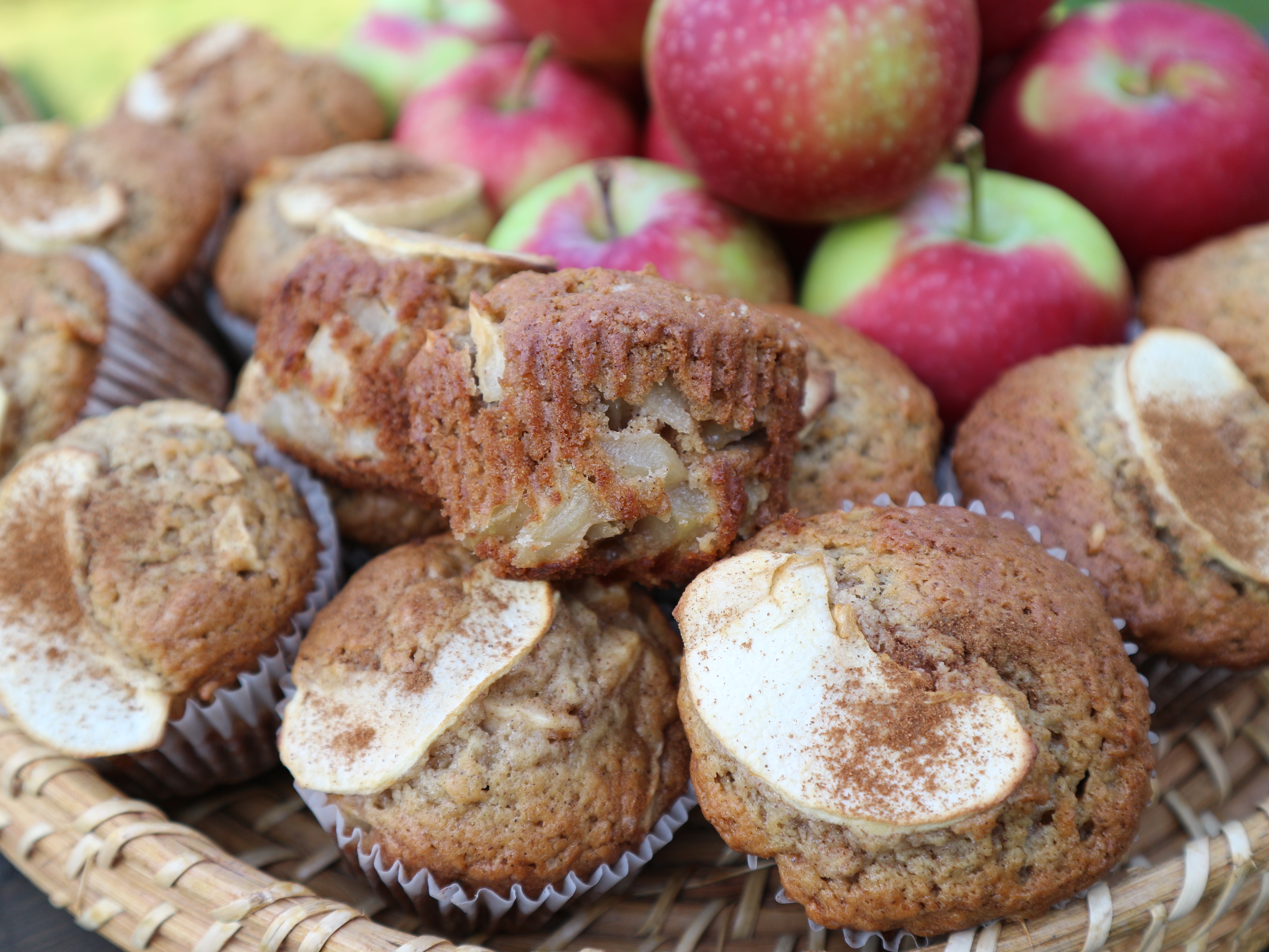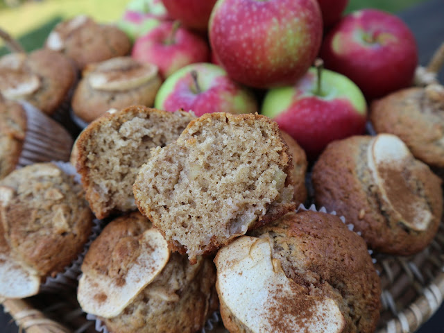 Here I tried it with diced apple and quartered apple slices for the top. I added cinnamon and nutmeg to the batter and also sprinkled cinnamon on top of the apple slice. They don’t look as pretty as the strawberry muffins, but they are very good in their own way.