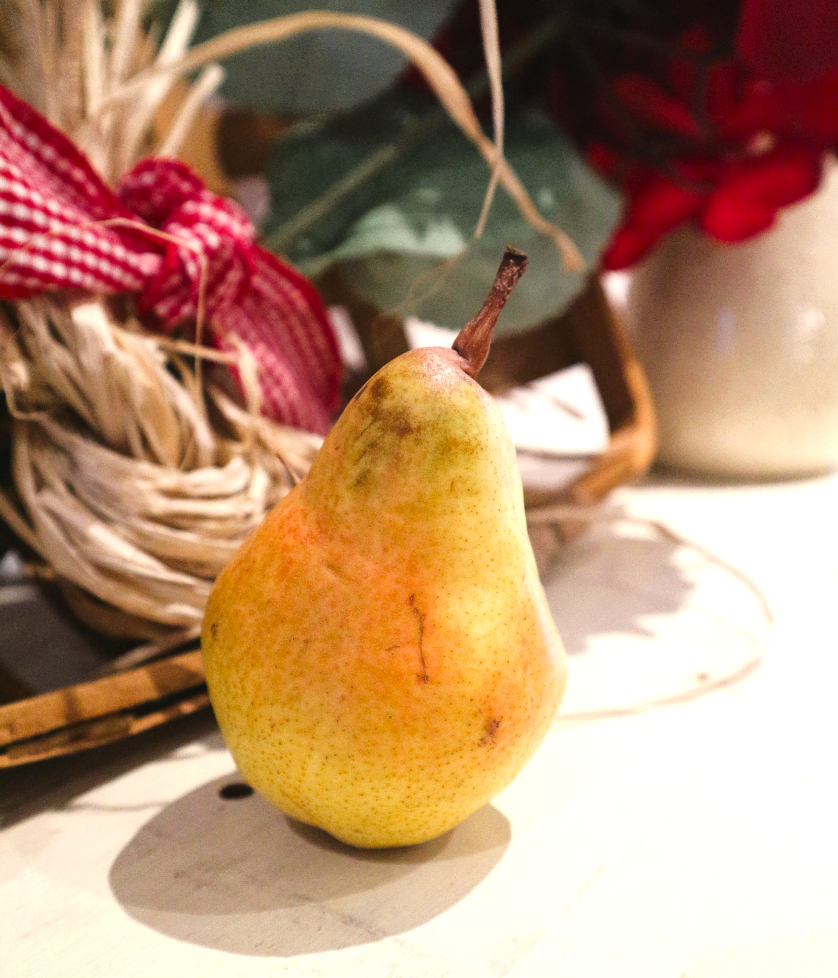 What’s not artificial is the flavor and smell of this perfectly ripe pear that I splurged on earlier this week at the grocery store. Years ago, a hostess shared small pears from her brother’s pear tree paired with delicious cheese and freshly made muffins. It is one of those food memories that stays with you forever. It also went a long way to helping me cultivate a love of good food served with beauty and style.